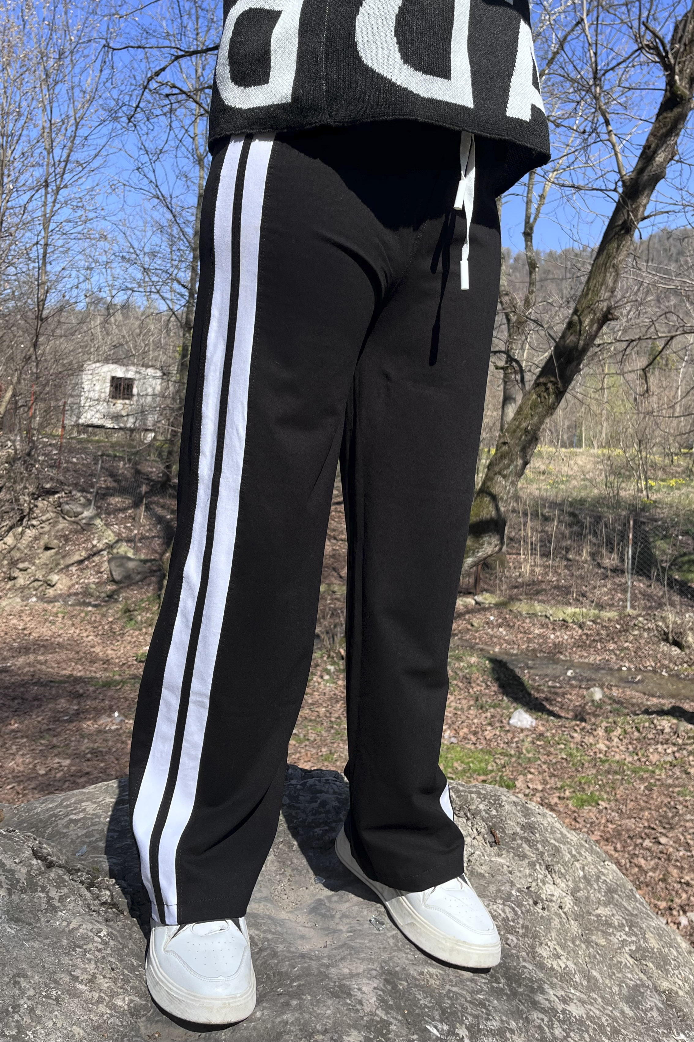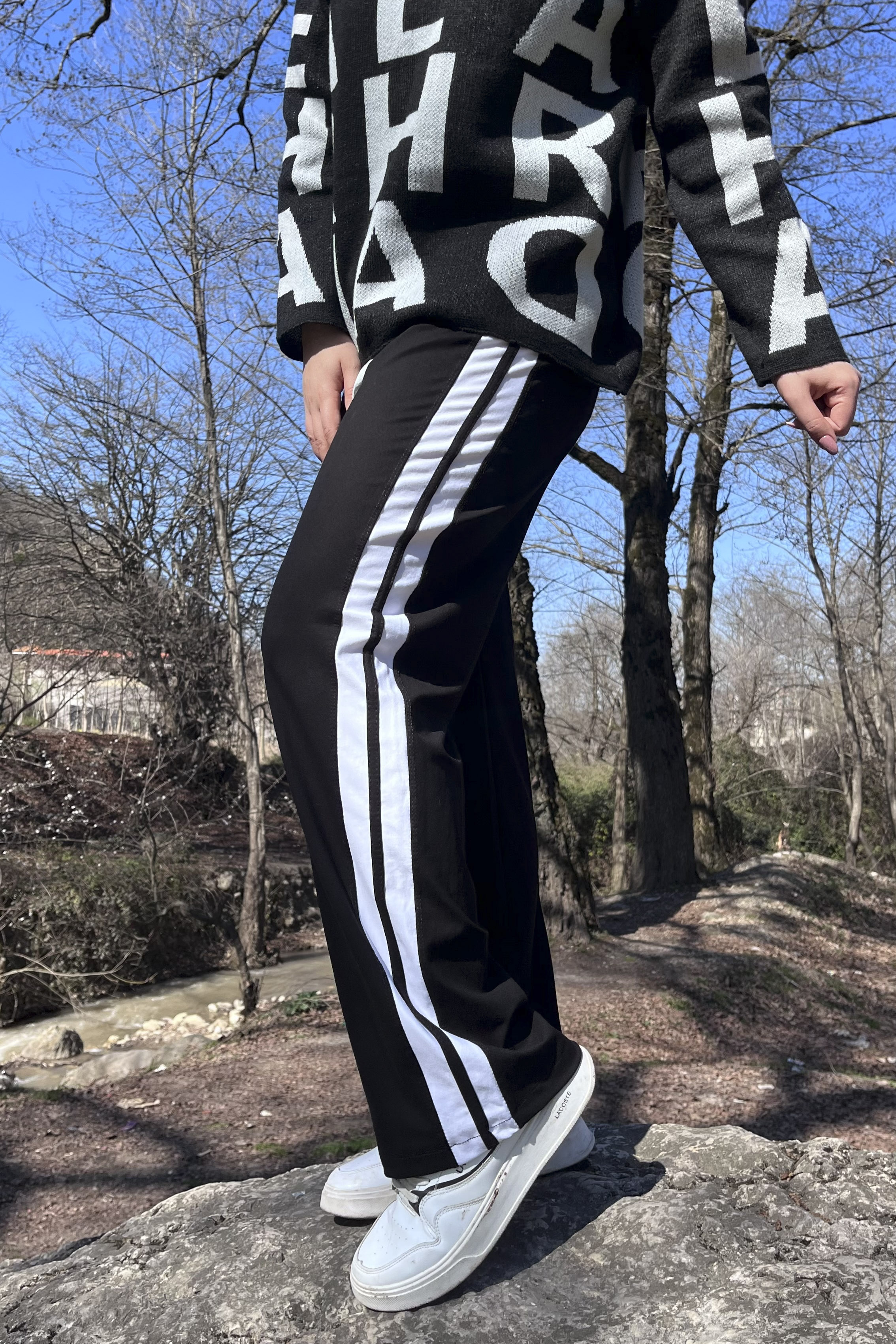 شلوار بغل خط دار سفید جنس لطیف و نرم مناسب برای بهار و تابستون رنگش مشکیه مشکیه فاق بلنده دور کمر کشی راحت سایز دور کمر تا48 میخوره راحت مناسب تا قد 175